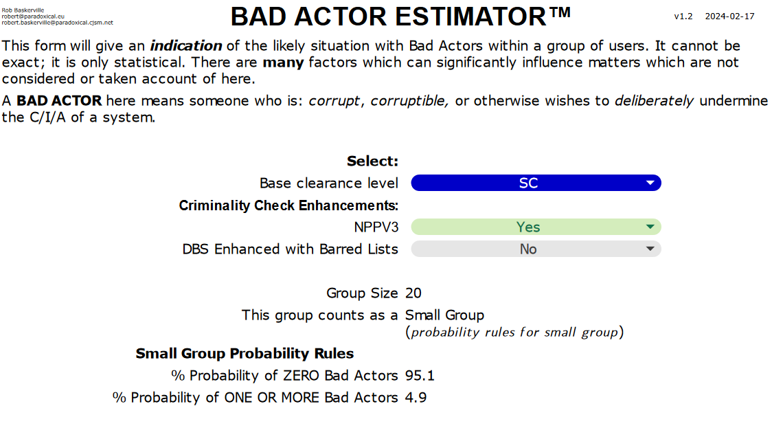 Thus for some time I have been developing, for my own use, a BAD ACTOR ESTIMATOR™ which automates the process and gives an indication at least of the probable situation with cleared groups. In order to give meaningful indications which can be applied without needing a detailed grasp of the statistics, the output comes as one of two types. For small groups2, the probabilities of there being zero vs one or more Bad Actors is given. For large groups, the probable range of numbers of Bad Actors is given.