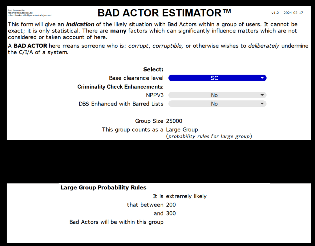 For this statistically large group of individuals, there is no realistic chance that there are no Bad Actors within the group. In fact, the most likely number of Bad Actors is in the range 200-300. In this situation, serious attention needs to be paid to the application design; the logging and Protective Monitoring design become especially important – not merely from the point of view of external attacks, but from the POV of insider threat too. Protective Monitoring needs detailed consideration in terms of what could be detected and how. Regular dip-sampling of logs may also be in order too. For this particular system, the design must cope with a significant number of Bad Actors as users – but this fact must be realised or it will not be designed & run that way.