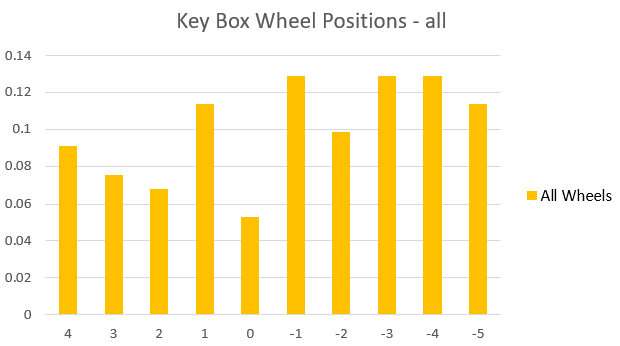 Looking at the aggregated results across all the wheels, I drew the following conclusion: the least likely place that any wheel is going to be left is on its combination value. This makes sense in terms of human behaviour, but of course it leaks information in the same way as Enigma being unable to encode a letter to itself. With enough samples recorded (estimate about 100 needed, so three times my sample size), I have a high probability of being able to read off the most likely combination from the graphs of individual wheel results, and may need to try a few minor variations.